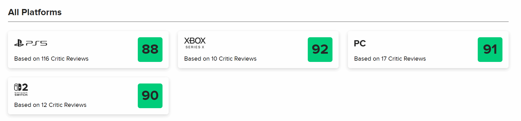 值得关注的是,尽管NS2版本的媒体评测样本数量较少,但其在Metacritic(M站)的评分却高于PS5版本,且并未出现因硬件适配而妥协性能的负面反馈,意外成为本次实体缺货潮中的“隐藏亮点”。对于未能抢到心仪平台实体版的玩家,目前唯一的选择便是通过数字商店预购,以确保能在发售时第一时间体验游戏。