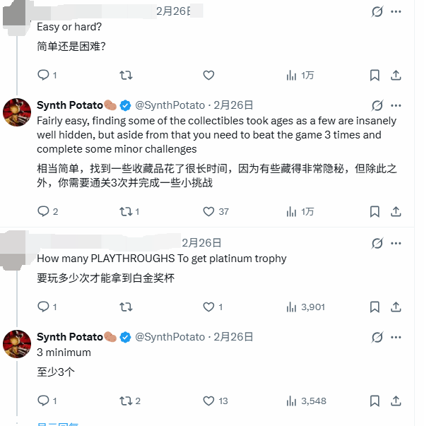 关于全成就的难度,Synth Potato也给出了自己的看法,他表示本作全成就的整体难度并不算高,但受限于成就解锁条件,玩家至少需要通关3周目,才能集齐所有成就,这也意味着想要拿下白金,必须投入足够的时间和精力。
