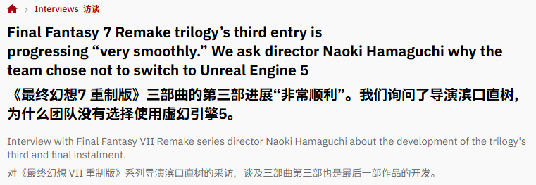 《最终幻想7》重制三部曲最终作的引擎选择引发玩家关注,近日游戏总监滨口直树在接受外媒Automaton采访时,明确表示第三部将继续沿用虚幻引擎4,放弃升级至虚幻引擎5,并再次强调目前游戏开发进展一切顺利,打消玩家对项目进度的顾虑。