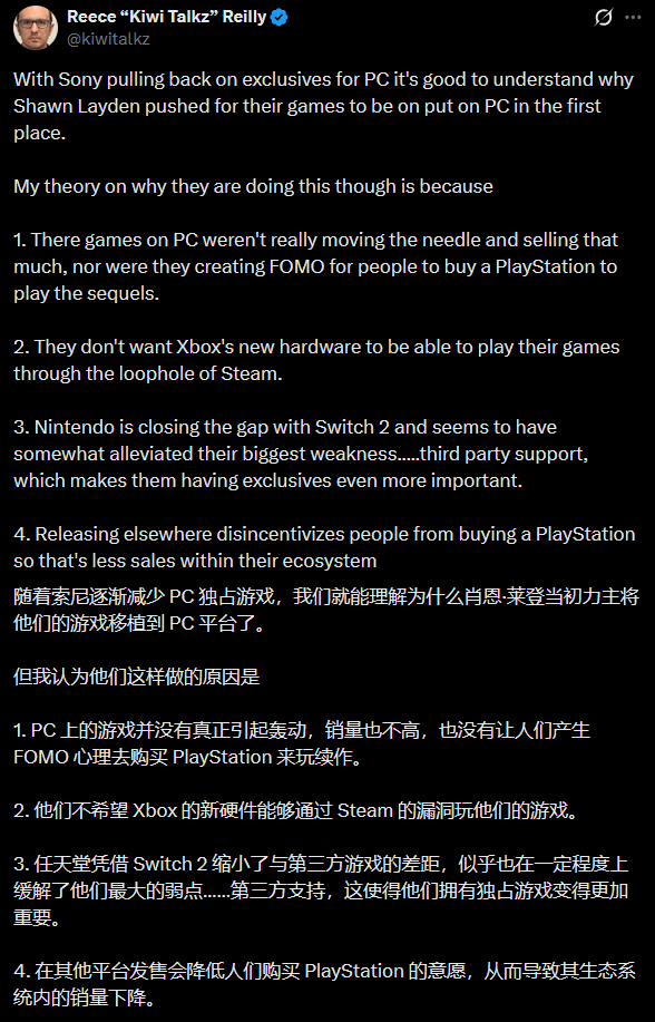 Kiwi Talkz分析指出,首要问题是PC版的销售表现并未达到预期效果。这些作品在电脑平台上既未创下惊人的销售纪录,也未能制造出足够的“错失恐惧”效应,导致玩家并没有为了体验续作而专门购入PlayStation主机。其次,索尼或许意在封堵漏洞,防止竞争对手Xbox的新硬件用户通过Steam间接游玩到自家的独占内容,从而保护自身的竞争壁垒。