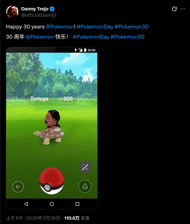 演员丹尼·特乔(Danny Trejo)在推特上发布动态,庆祝《宝可梦》系列诞生30周年,配图更是玩梗致敬了自己在《绝命毒师》中的经典名场面,引发网友热议。