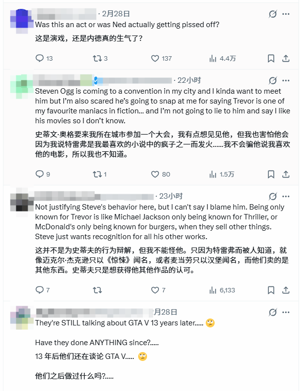 对此,玩家社区的看法呈现两极分化。支持Ned Luke的一方认为,既然依靠该角色获得知名度并出席活动获利,理应至少深入了解作品内涵,批评Steven Ogg“一边赚取出场费,一边贬低游戏载体”。而挺Steven Ogg的声音则指出,演员的核心职责是表演,不应强制要求其成为玩家,他更希望被视作专业艺人而非仅仅是一个游戏角色的符号。更有不少网友调侃,这两人的现实互动完美复刻了游戏中麦克与崔佛那种相爱相杀的关系,甚至有人戏称期待在《三男一狗2》问世前看到更多类似的现场交锋。截至目前,双方尚未就此事发表正式声明,但围绕角色、演员以及游戏态度的争论,在作品发售13年后依然热度不减。