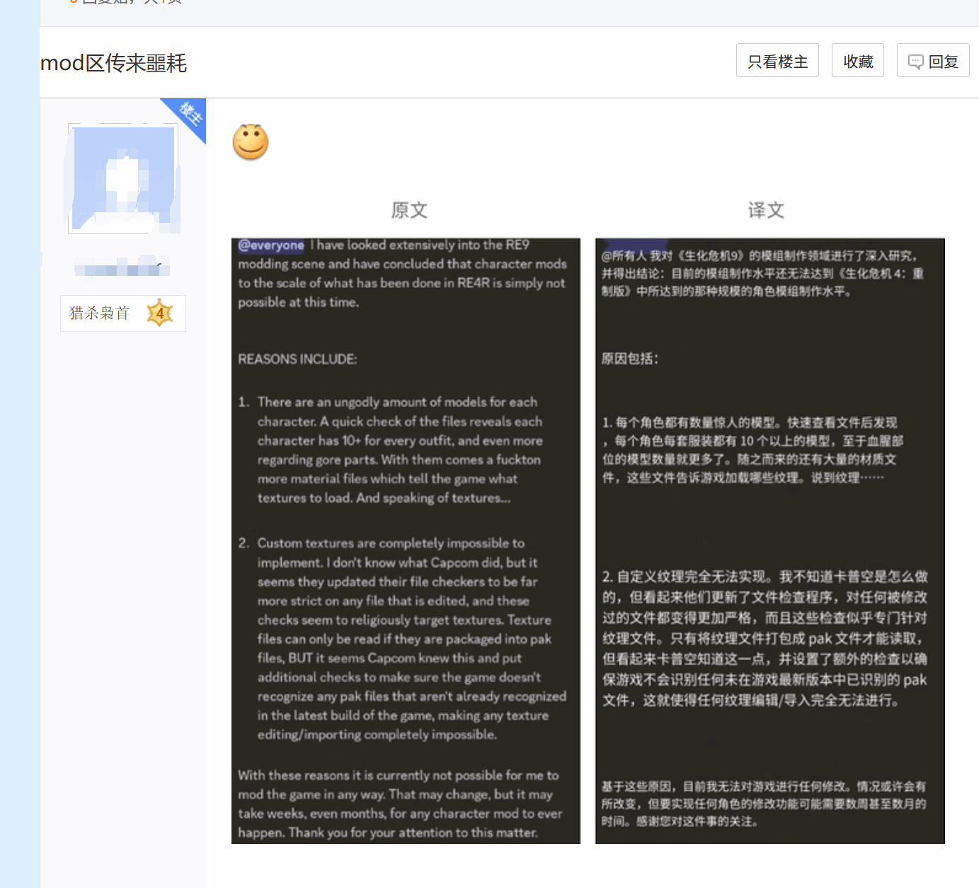 此事在Steam游戏论坛上引发玩家热议,不少玩家对此表示担忧,明确指出游戏模型疑似被添加了反MOD保护,纷纷质疑卡普空为何要设置这样的限制。玩家们认为,MOD不仅能优化游戏画质,还能修复官方遗留的问题、增加无障碍选项,甚至在官方停止更新支持后,延长游戏的生命周期,卡普空此举无疑是一种“倒退”。