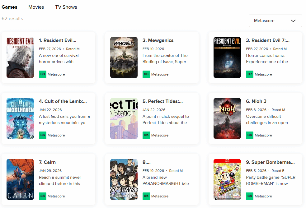在专业媒体评价方面,本作凭借88分的平均分成功登顶Metacritic榜单,成为今年截至目前评分最高的作品。值得一提的是,榜单季军同样来自该系列,即登陆NS2平台的《生化危机7黄金版》,显示出卡普空在近期强大的产品实力。
