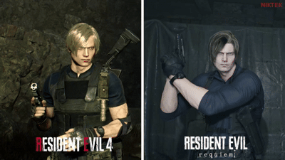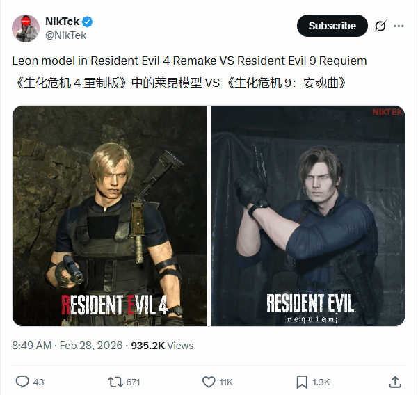 X平台博主NikTek近日发布了一组对比图,展示了《生化危机4:重制版》中36岁的里昂·S·肯尼迪与《生化危机9:安魂曲》里49岁版本的角色差异。