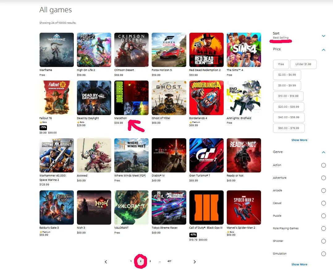 根据网友PopularButLonely整理的销售榜单,《马拉松》的市场表现远不及预期。在Steam热销榜上,该作仅位列第9,甚至落后于已发售五个月的《ARC Raiders》(排名第4)。而在PlayStation商店中,其处境更为严峻,不仅未能进入首页推荐,排名更是跌至第33位,被众多长销老作远远甩在身后。这种预售阶段的疲软表现,引发了社区对游戏首发销量的广泛担忧。