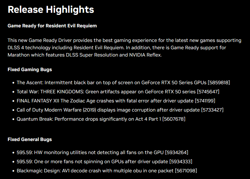 在此之前,英伟达曾推出595.59 WHQL驱动,本意是为《生化危机9:安魂曲》提供首发支持,但该版本上线几小时后就被官方紧急下架,并提醒已安装的玩家退回旧版。问题根源在于驱动存在致命漏洞,会造成显卡风扇监测数据异常,甚至出现更新后显卡风扇无法正常转动的情况。