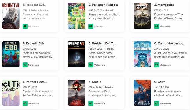 据外媒Gamespark报道,Metacritic网站近日更新了评分数据,卡普空旗下的《生化危机9:安魂曲》凭借优异表现,以89分的综合成绩暂时坐稳了2026年已发售游戏的头把交椅。这一结果标志着日系大作在今年的开局阶段便展现出了极强的竞争力。