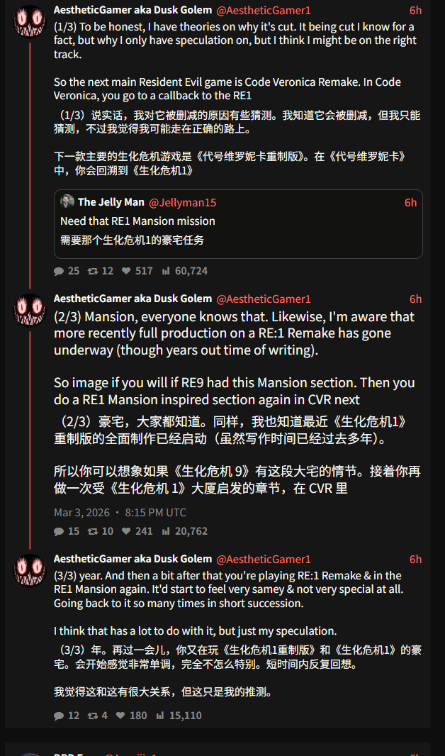 Dusk Golem同时提到,卡普空还在规划《生化危机0》与《代号:维罗妮卡》的重制工作。不过他也提醒,初代重制版在现阶段仍存在被中止的可能性,因为厂商历史上曾有过中途取消项目的情况。