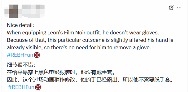这段视频清晰展示了里昂不同服装下的过场动画差异:当玩家为里昂更换不含手套的服装后,游戏中一段原本需要“摘下手套查看手部”的过场,会自动调整演出逻辑,直接省略摘手套的动作,让角色行为与服装状态保持一致。这种不刻意张扬的细节适配,很快引发玩家们的跟风讨论,不少人开始分享自己发现的类似设计。
