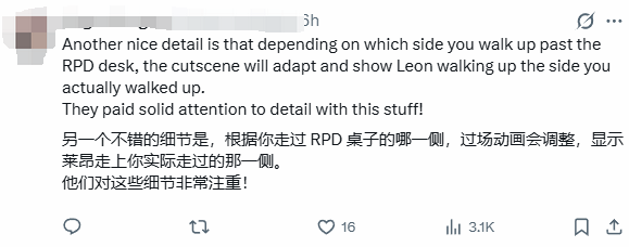 除了换装相关的隐藏细节,还有玩家在讨论中提及游戏的动态演出机制。据其描述,当玩家操控角色经过RPD(浣熊市警察局)办公桌场景时,过场动画的运镜角度并非固定不变,而是会根据玩家实际行走的路线——无论是从办公桌左侧还是右侧通过,系统都会实时适配,呈现出不同的镜头效果,让每一次游玩的体验都有细微差异。