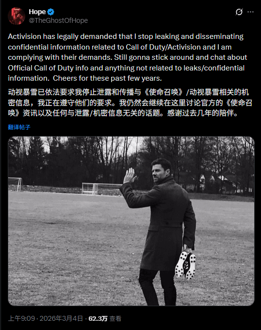 Hope在X平台发文,明确透露了退圈的缘由:“动视已通过法律手段要求我停止泄露和传播与《使命召唤》/动视相关的机密信息,我会遵守他们的要求。我仍会留下来聊聊官方公布的《使命召唤》信息,以及任何不涉及泄密或机密内容的话题。感谢过去这几年的陪伴。”