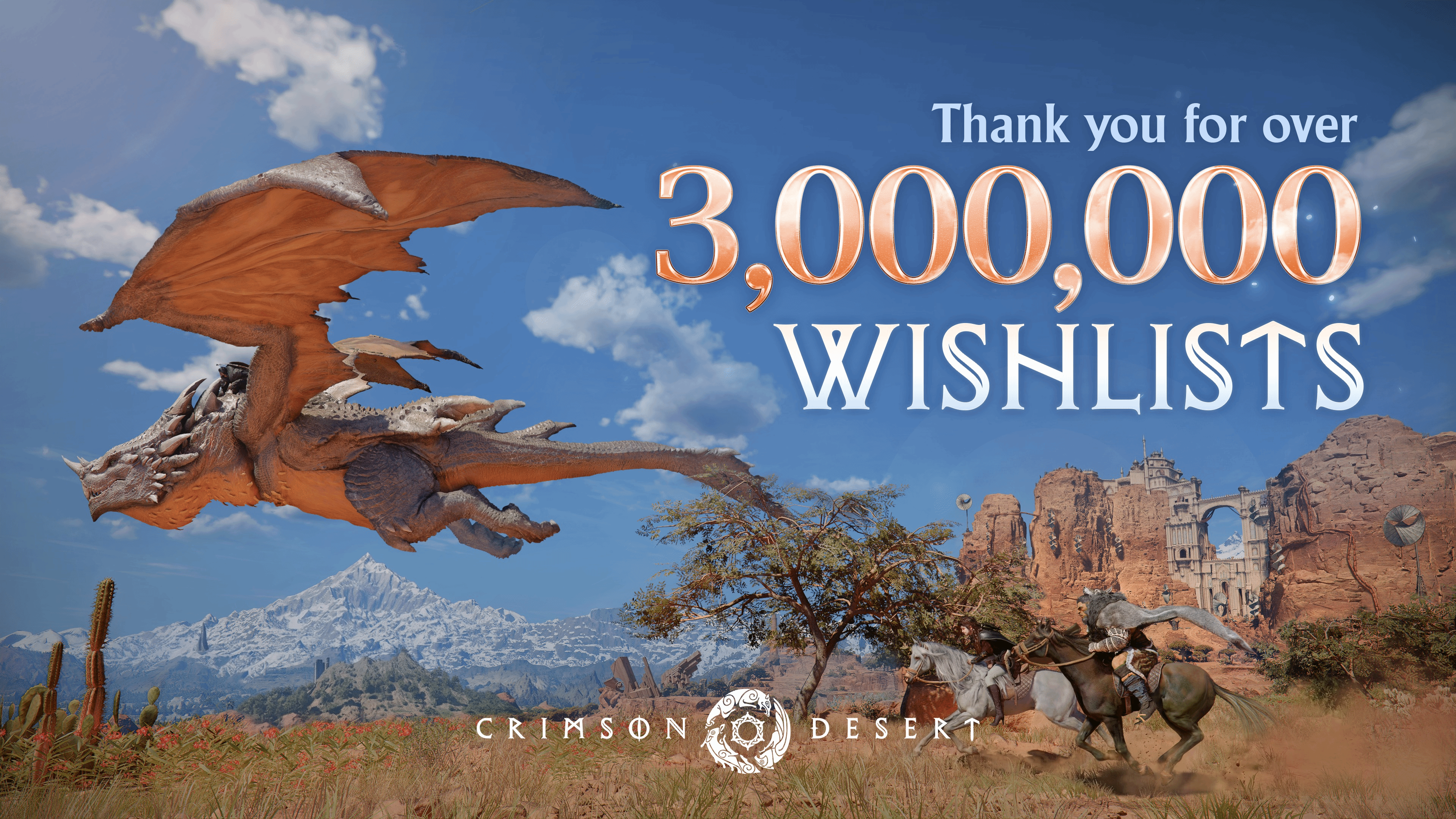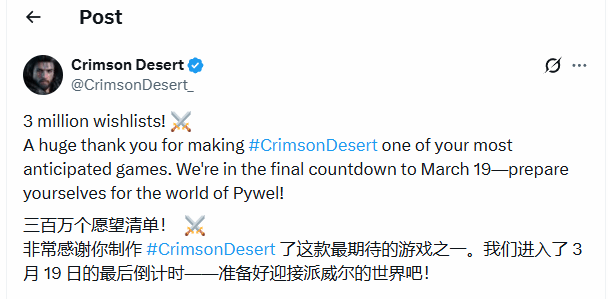 《红色沙漠》官方近日在社交平台发布庆祝海报,正式宣布该作在各大平台的愿望单数量已突破300万。与此同时,制作方确认游戏将于3月20日(北京时间)正式解锁,全球玩家期待已久的帕卫尔大陆之旅即将开启。