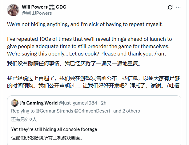 针对这些铺天盖地的质疑,Pearl Abyss的公关与市场总监Will Powers近期在社交平台作出正面回应,直接反驳了玩家的相关指责。他明确表示,开发团队从未隐瞒任何内容,自己早已厌倦反复重申这一点,同时强调,官方早已承诺会在发售前公开相关信息,确保玩家有充足时间判断是否预购。