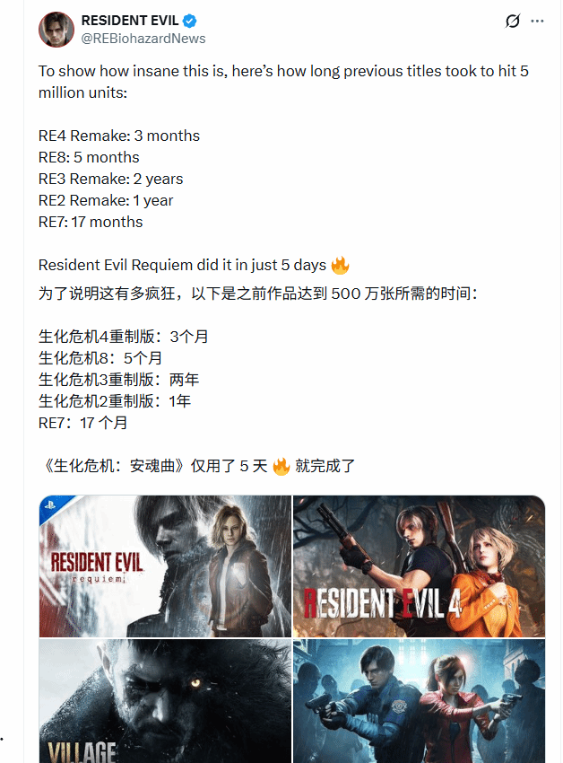 近期刚刚发售的《生化危机9》正式达成500万销量成就,这一里程碑式的成绩也让其成为《生化危机》系列历代作品中,最快突破该销量关口的一作。为庆贺这一重要时刻,《生化危机》官方推特特意发布了一张手绘风格的贺图,以此答谢全球玩家的支持。