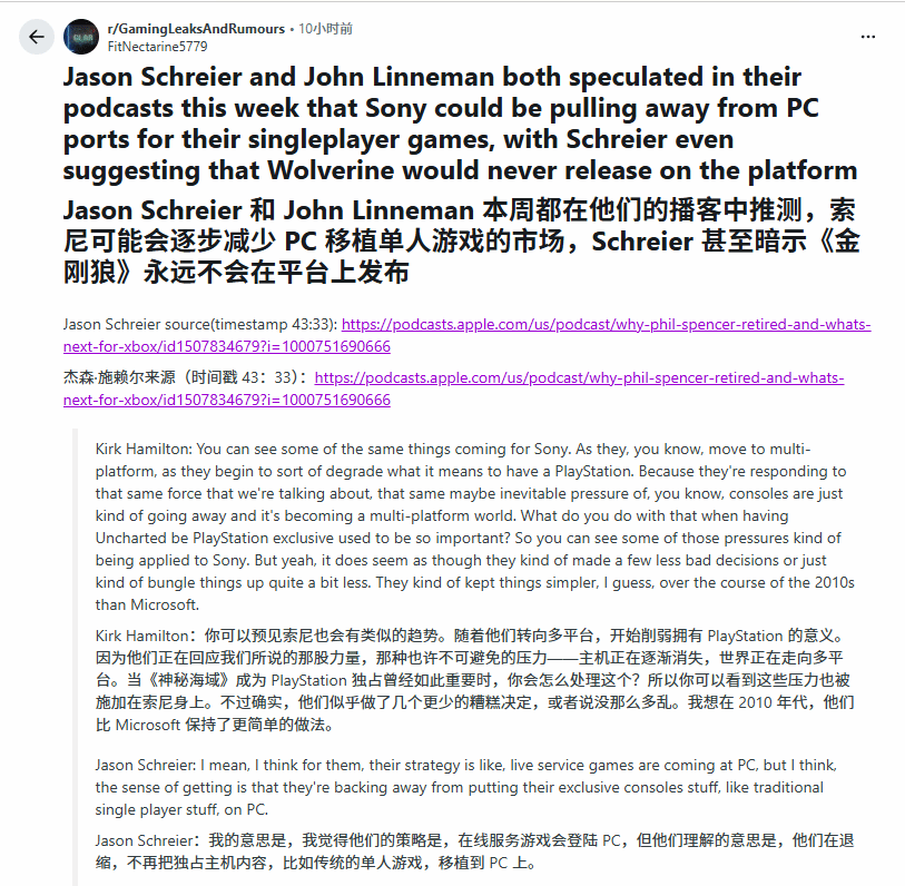 Schreier的观点尤为激进,他直接暗示,许多玩家翘首以盼的《漫威金刚狼》恐怕将彻底无缘PC,成为主机专属体验。他进一步剖析称,索尼目前的思路已变得清晰:在线服务型游戏仍会继续登陆PC以扩大用户基数,但那些传统的、以叙事为核心的单人独占作品,正逐渐被从PC计划中剔除。这种策略被形容为比2010年代微软的做法更为保守,旨在通过强化主机端的独家内容来巩固PlayStation生态的护城河。