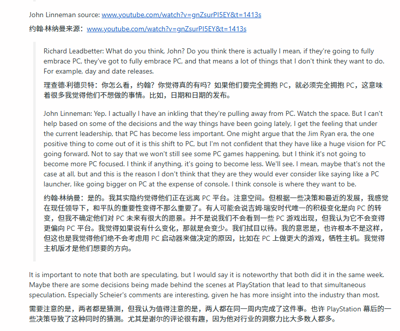 John Linneman也表达了极为相似的担忧。他指出,从索尼近期的种种动向来看,PC平台在其整体版图中的优先级正在下降。虽然无法确定这是否是对前任CEO吉姆·瑞安时期激进扩张策略的修正,但他确信索尼未来的PC游戏输出量不仅不会增长,反而面临收缩的可能。Linneman强调,无论市场如何多平台化,索尼的根本始终在于主机业务,绝不会为了迎合PC市场而稀释主机的独占优势。