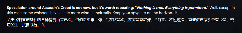 此次官宣是由育碧内容负责人Jean Guesdon在全新官方博客中完成。他在博客里简要回顾了《刺客信条》系列的发展历程,随后以隐晦又充满巧思的方式,透露了重制版的消息。Jean Guesdon写道:“围绕《刺客信条》的各种猜测早已不是什么新鲜事,不过那句老话依然值得重申:‘万物皆虚,万事皆允。’当然,至少在这一次,并非所有传闻都只是空穴来风——有些低语,确实已经乘上了顺风。把你的望远镜对准地平线吧。”
