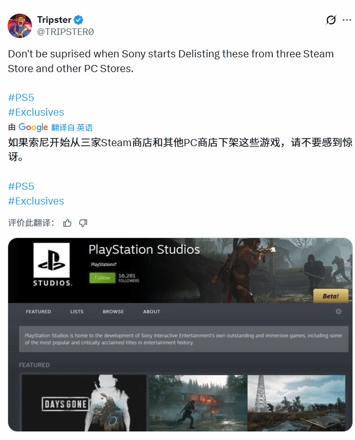 就在近期,博主@TRIPSTER0在社交平台上表达了自己的顾虑,他认为索尼的动作可能不止于停止后续游戏移植,甚至有可能将已经在Steam等PC平台上架的作品全部移除。这位博主公开表示:“要是索尼哪天开始从Steam以及其他PC游戏平台下架这些作品,大家不用觉得意外。”这番话一出,立刻引发了玩家群体对索尼未来PC市场布局的热烈争论。