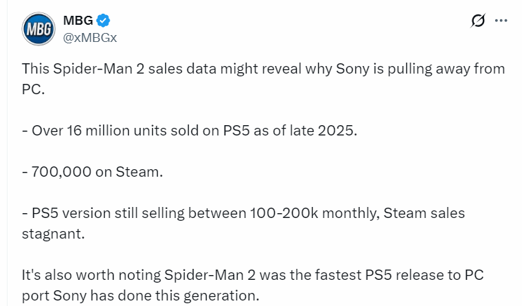 销量差距的悬殊的背后,是玩家对发售节奏与定价的双重不满。以《漫威蜘蛛侠2》为例,该作在PS5平台的销量早已突破1600万份,每月仍能保持约10万份的稳定销量,但登陆PC平台后,销量连100万份都未达到,Steam平台的销量增长更是陷入停滞。玩家普遍反映,索尼多数主机独占作品,往往要在主机首发一年甚至更久后才会移植到PC,此时游戏的剧情、玩法早已被广泛传播,玩家的新鲜感大打折扣,可即便如此,这些“过时”作品登陆Steam时,依然维持着偏高的定价,这也让不少PC玩家选择观望,甚至直接放弃购买。