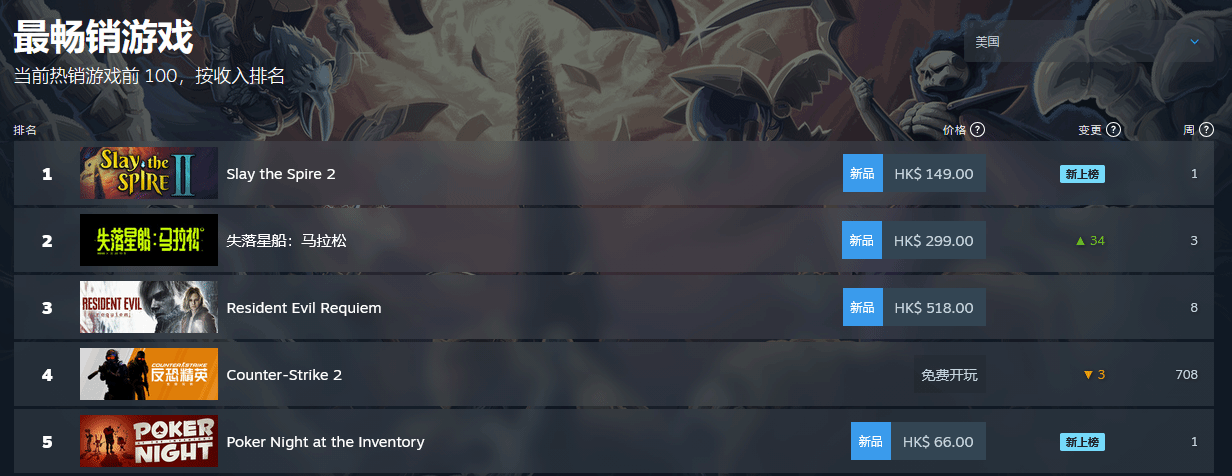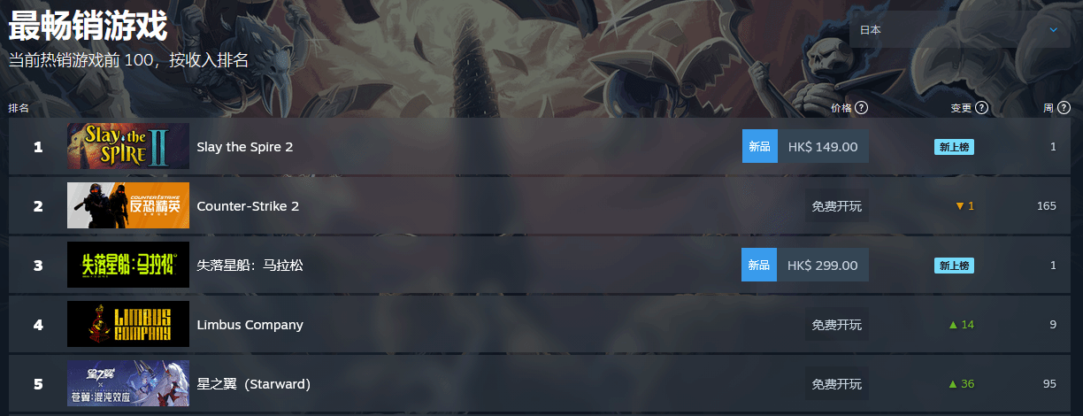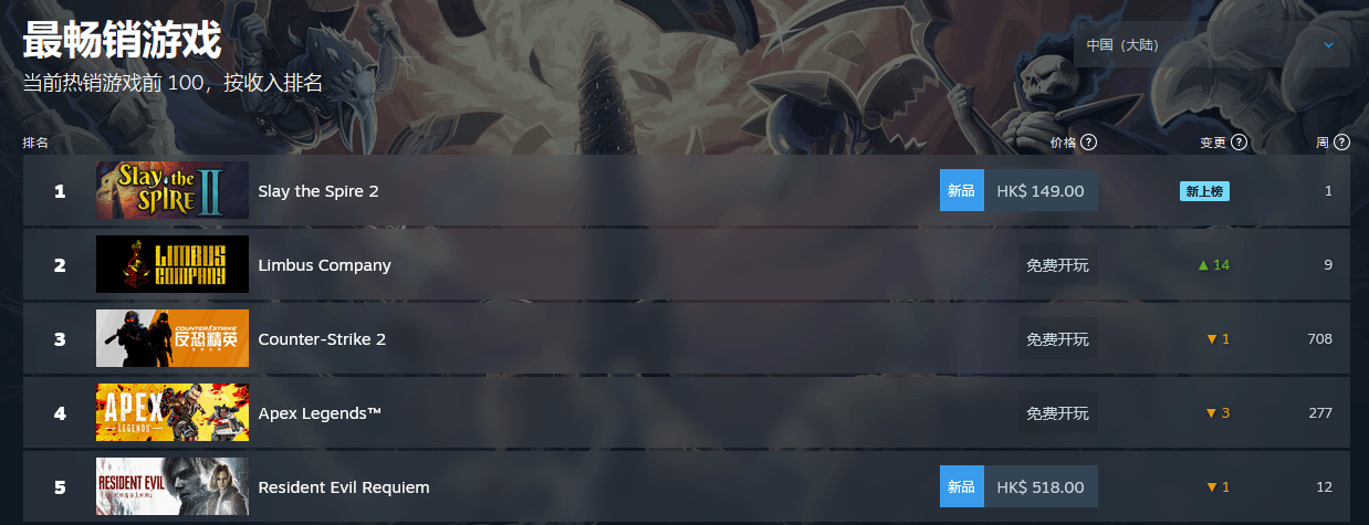 除了拿下全球榜首,《杀戮尖塔2》在多个国家和地区的Steam畅销榜中也表现强势,其中包括中国大陆、美国、日本等主要游戏市场,均稳定占据榜首位置。