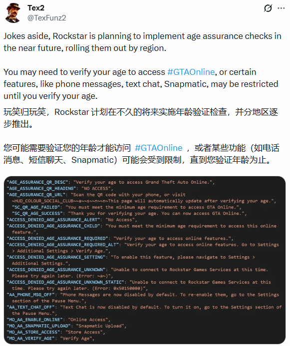 早在去年,知名数据挖掘者Tex2(原名Tez2)就曾通过深挖游戏数据发现,《GTA Online》中其实早已内置了年龄验证系统,只是该系统自添加后始终处于未启用状态,并未对玩家体验产生任何影响,这也意味着Rockstar早已提前布局相关功能,为后续合规做好了准备。