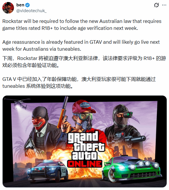 关于验证方式,videotechuk明确表示,玩家需向第三方服务提供商提交个人身份证件,或完成面部扫描,通过审核后才能正常游玩游戏。而gameranx进一步追踪得知,Rockstar此次启用年龄验证功能,核心是为了遵循澳大利亚2021年《网络安全法》中的“预期要求”部分,该要求明确规定网络服务提供商需采取有效措施,防止未成年人接触不适宜其健康成长的游戏内容。