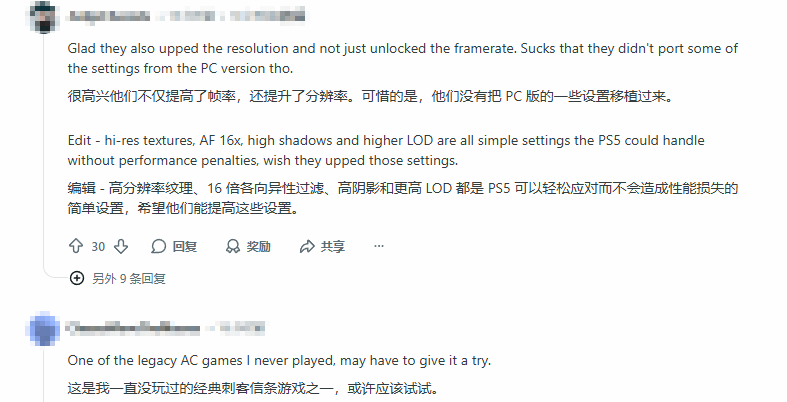 除了基础参数的提升,制作组在细节修复上也颇费心思。此前困扰玩家的“布料物理”问题得到了妥善解决:在60帧模式下,主角阿尔诺的外套不再异常地紧贴腿部,而是呈现出自然的飘动效果。这一细微之处的修正,足见本次更新的诚意。当然,也有部分硬核玩家指出,虽然主机版进步明显,但相比PC端,仍缺少高分辨率纹理、16倍各向异性过滤以及更高级的阴影和LOD(细节层次)设置。考虑到PS5的硬件性能,大家普遍期待官方未来能进一步开放这些高级选项。