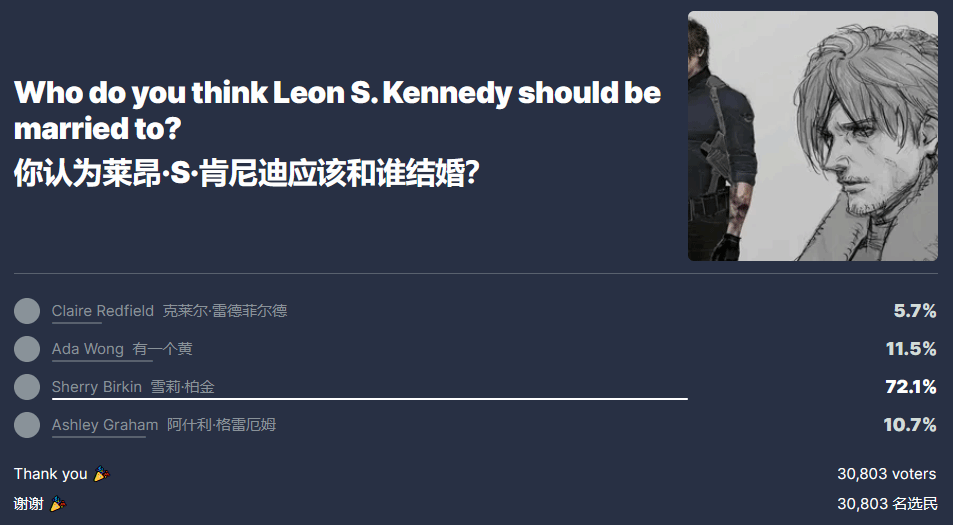 针对这一悬念,知名媒体IGN发起了一项趣味调查,邀请玩家选出心中最适合与里昂步入婚姻殿堂的女性角色。截至统计时,共有30803名参与者表达了观点。结果出炉后令人大跌眼镜:长期以来被许多粉丝视为“官配”的艾达·王,此次仅获得了11.5%的支持率;而被戏称为“碍事梨”的阿什莉·格拉汉姆也仅有10.7%的票数;克莱尔·雷德菲尔德则占到了5.7%。令人意外的是,雪莉·柏金以压倒性的72.1%得票率遥遥领先,成为了绝大多数玩家心目中的“里昂夫人”。