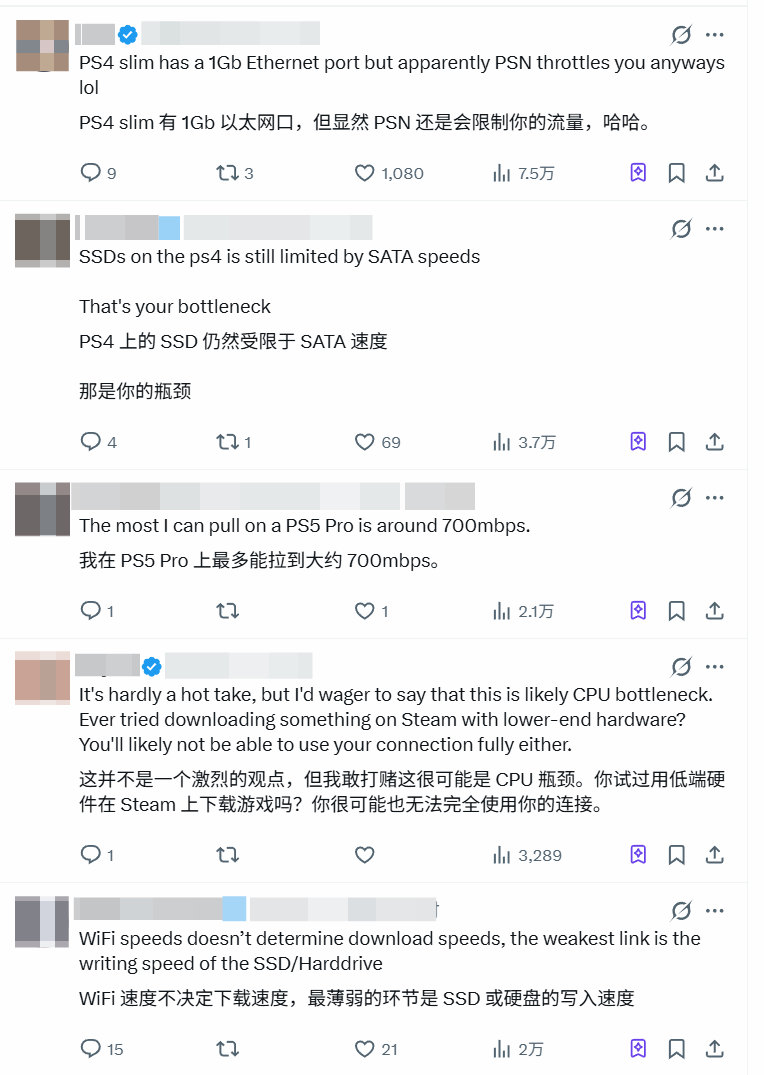 有玩家举例说明,PS4 Slim明明配备了千兆网口,但连接PSN服务器下载时,速度却被暗中限制,始终达不到硬件应有的水平;即便是目前性能顶尖的PS5 Pro,也有玩家反馈,其下载速度峰值最多只能达到700Mbps左右,远未达到千兆带宽的上限。