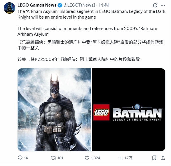 作为TT Games开发、Warner Bros. Games发行的新作,《乐高蝙蝠侠:黑暗骑士遗产》早在2025年科隆游戏展上就完成了首次亮相。开发团队曾表示,本作致力于成为蝙蝠侠的“终极”故事版本,会提炼数十年蝙蝠侠系列的精彩内容,让玩家沉浸式体验成为黑暗骑士的感觉,而此次致敬《阿卡姆疯人院》,也是对蝙蝠侠经典IP的一次致敬与传承。