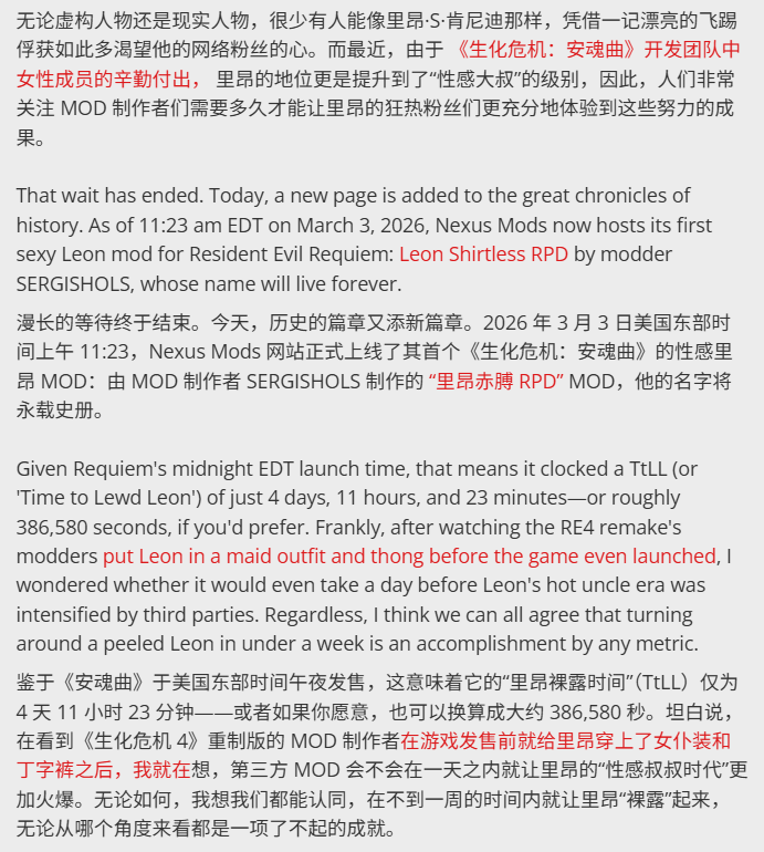 争议的导火索,是PC Gamer近期发布的一篇关于《生化危机9:安魂曲》的报道。文章中,记者难掩兴奋之情,称游戏发售仅四天,Nexus Mods平台上就出现了首款针对里昂·肯尼迪的“脱衣”MOD。这款名为“R.P.D.制服无上衣里昂”的MOD,核心功能是移除里昂的衬衫,而PC Gamer在报道中更是用近乎庆祝的语气评价此事,直言“不到一周就出现‘裸上身里昂’不管从哪方面看都是一项成就”,还写道“我很高兴我们都能共同见证这一刻”。