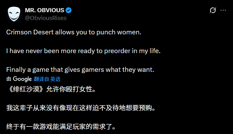 不过,这段演示本身并未引发太多讨论,真正引爆玩家社区的,是该博主配文里的不当言论。他用一种戏谑的语气写道:“《红色沙漠》竟然允许玩家殴打女性,我这辈子从来没有这么急切地想要预购一款游戏,终于有游戏能满足我的需求了。”