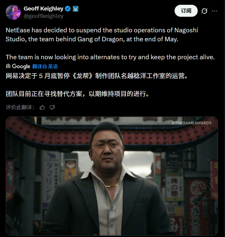 彭博社曝出一则震动游戏圈的消息:网易将正式停止为名越稔洋领导的工作室提供资金支持,这也是网易近期缩减游戏开发规模计划中的又一重要举措。作为曾打造《如龙》系列、被玩家称为“如龙之父”的知名制作人,名越稔洋及其工作室的新作开发,自2021年起就一直得到网易的资金扶持,如今五年资助戛然而止,引发全网关注。