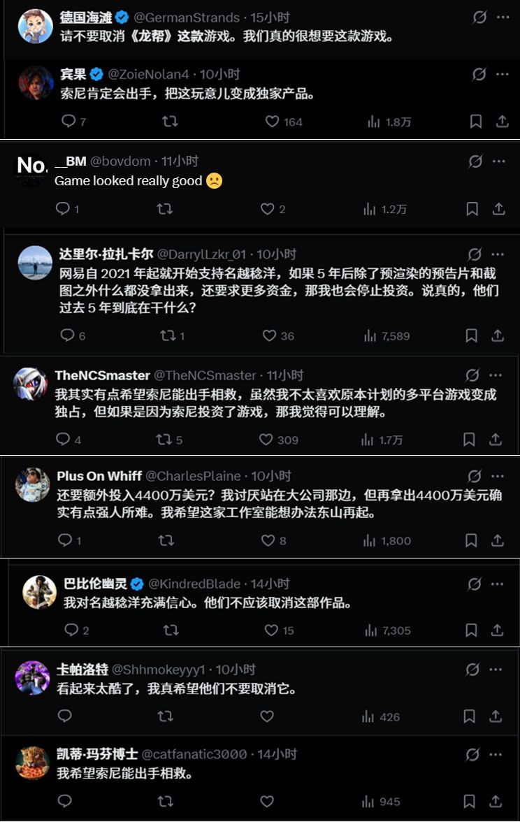 支持项目的玩家占了不小的比例,不少人直言不舍,有人留言表示:“请不要取消《龙帮》这款游戏,我们真的很想玩到它。”还有玩家抱有期待,认为即便网易撤资,也可能有新的发行方接手,“说不定索尼会出手,把它变成独占游戏,这款作品看起来真的很不错。”除此之外,还有不少名越稔洋的粉丝,始终对他的创作能力充满信心,坦言:“我完全相信名越的能力,希望这个项目不要被取消。”