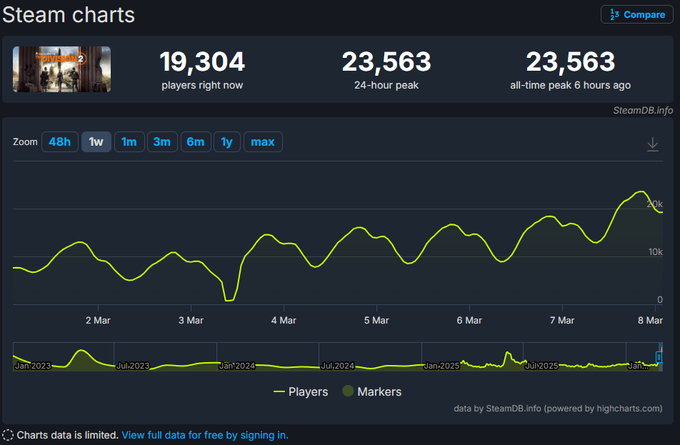 据SteamDB数据显示,在这份内容路线图公布之前,《全境封锁2》的Steam同时在线玩家数一直处于低迷状态,仅在3500人左右徘徊,作为一款曾备受关注的TPS+MMORPG类游戏,这样的在线人数显然与其口碑和地位不符。但路线图一经公布,玩家热情瞬间被点燃,过去24小时内,游戏同时在线人数直接飙升至23563人,与此同时,各大直播平台上,这款游戏的观众数量也随之直线上涨,曾经的热门大作再度回归大众视野。