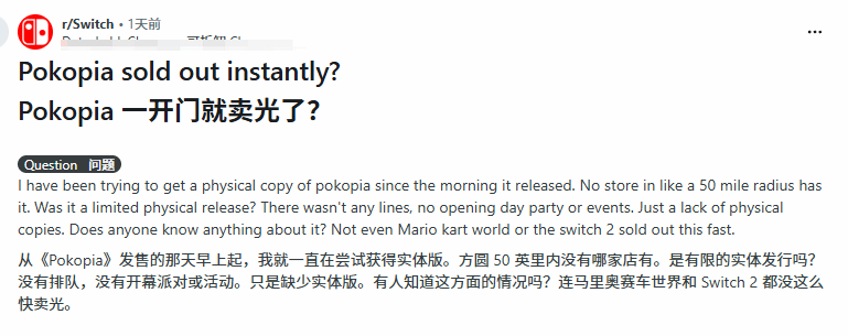 Reddit社区玩家近日发现一个极具反差感的现象:任天堂Switch2主机备受诟病的钥匙卡设计,明明遭到玩家集体吐槽抵制,但其首款采用该形式发行的第一方作品《宝可梦Pokopia》,实体版却在全球各大零售商处迅速售罄,上演了一场“骂得越狠,买得越疯”的戏码。