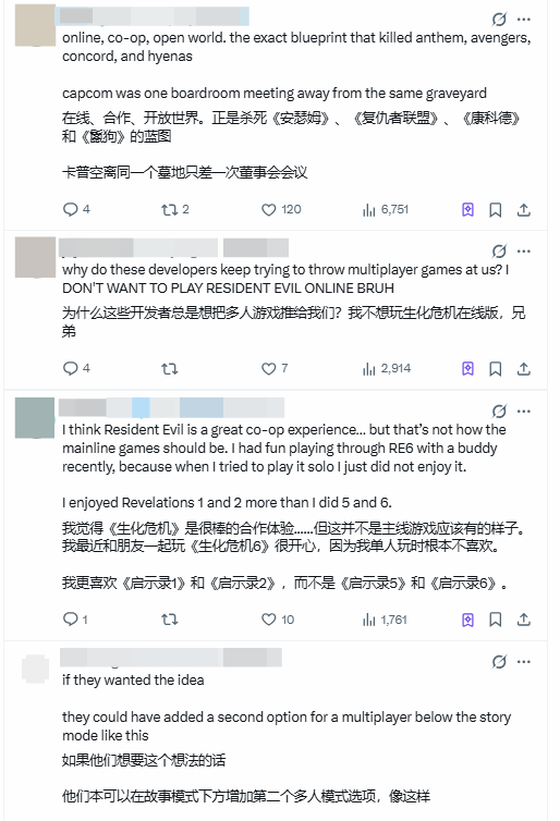 也有资深老玩家对卡普空的尝试表示理解,他们认为:“卡普空确实可以做一款类似《腐烂国度》那样的生化题材生存游戏外传,侧重社区运营与多人协作的机制会很有看点,但万幸正传没有偏离轨道。”不过也有玩家给出毒舌评价,直言“我不反对和朋友一起解谜,但卡普空的强项根本不在网游开发上,真做了大概率也是翻车”。