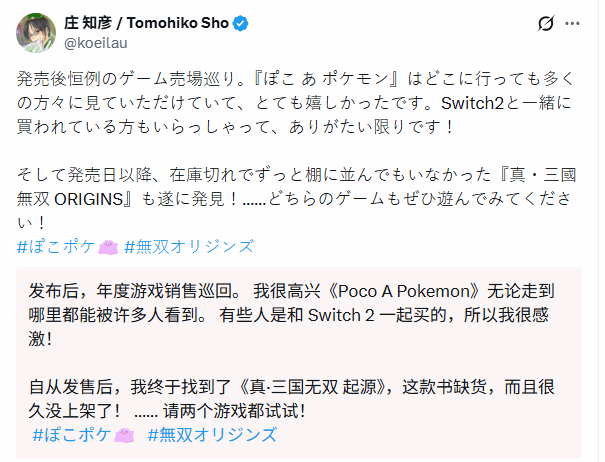 《真三国无双》系列制作人庄知彦在社交平台分享了自己逛线下实体游戏店的经历,言语间满是感慨。他表示,店内货架几乎被《宝可梦:pokopia》全面占据,自己耗费不少时间,才在众多游戏中找到自家新作《真三国无双:起源》。