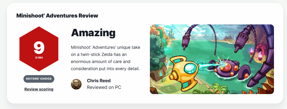IGN在简评中提到,《小飞船大冒险》巧妙融合了双摇杆射击与塞尔达式探索玩法,开发团队在游戏的每一处细节上都花费了大量心思,打磨得十分细致。9分的高分,也足以体现这款游戏的综合水准。