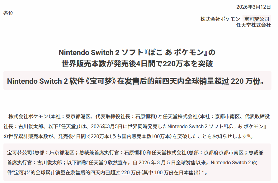 任天堂官方今日通过新闻稿正式公布了《宝可梦Pokopia》的销量捷报,这款全新宝可梦题材作品自3月5日发售以来,人气持续飙升,仅用4天时间,全球销量便成功突破220万份,其中日本地区销量独占100万份,成为近期最受玩家欢迎的宝可梦衍生作品之一。