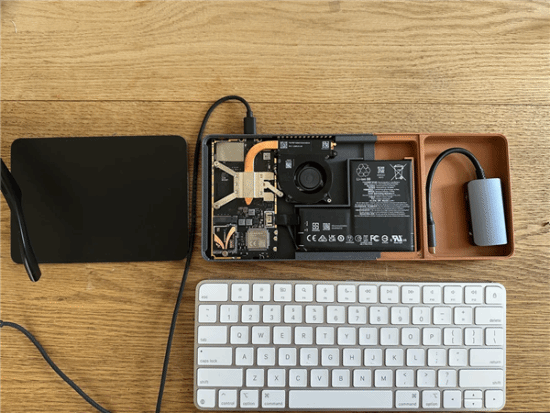据介绍,改装者将Steam Deck的主板、电池等硬件从原机壳中取出,安置于定制3D打印外壳内,并整合至妙控键盘底部。外壳采用双腔室设计:左侧主腔室容纳全部核心硬件及电池,侧面和顶部预留通风口,保障APU散热风扇的空气流通;右侧副腔室作为拓展存储空间,当前用于放置Type-C USB集线器。