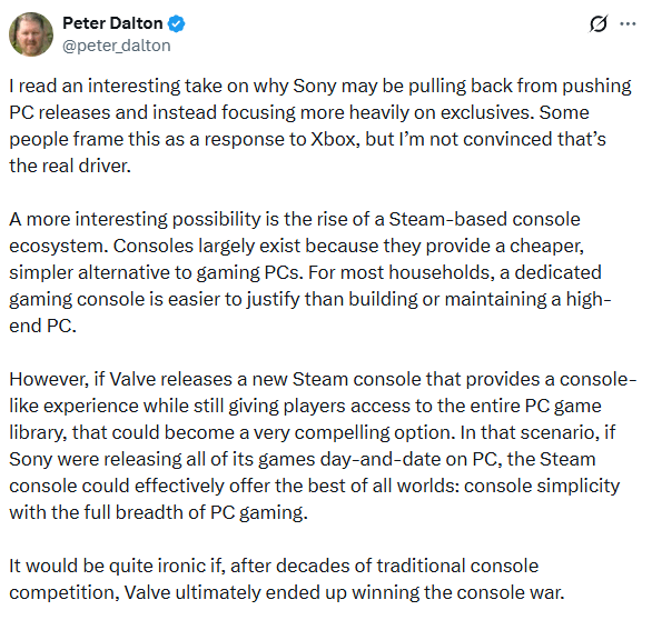 Dalton进一步分析,Valve在硬件领域的崛起,才是促使索尼调整策略、重回独占路线的关键原因。他表示,依托Steam平台发展起来的主机生态正在快速崛起,而主机的核心优势本就在于比游戏PC更廉价、更易操作,对于大多数普通家庭来说,购买一台专用主机,远比组装、维护一台高端PC要省心得多。
