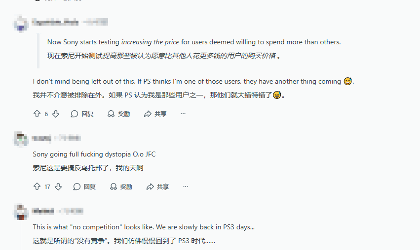 reddit论坛上有消息曝光,索尼正在美国地区对部分用户开展定向提价的A/B测试。该消息由数据挖掘团队PSPrices率先披露,相关线索均来自其对PlayStation Store后台数据的挖掘整理,截至目前,索尼官方尚未就此事发布任何说明,这项测试也始终处于未向用户明确告知的状态。