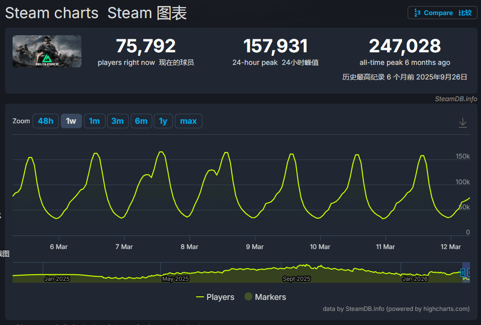 SteamDB的最新监测数据给出了最直观的对比:目前《战地6》的同时在线玩家人数约为47800人,而免费运营的《三角洲行动》,同时在线用户已突破157000人,后者在线人数是前者的3倍多,差距十分悬殊。要知道,《战地6》作为EA旗下的经典IP新作,售价高达268元人民币,而《三角洲行动》的免费模式,无疑为其赢得了更多玩家青睐,成为拉开差距的关键因素之一。