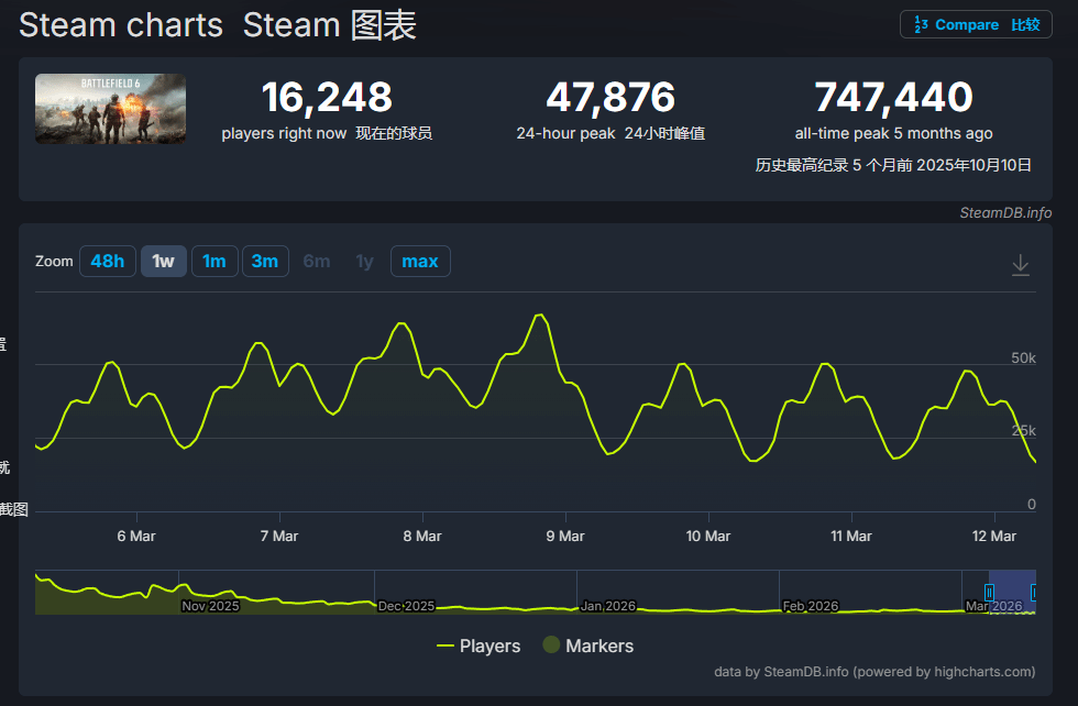 回顾《战地6》的表现,其2025年刚上线时曾迎来爆发式热度,首发峰值在线人数甚至突破74万,跻身Steam历史上第14大高峰在线人数游戏,创下了系列纪录。但仅仅过去几个月,这款游戏的热度便急剧降温,如今在Steam全球排行榜上已跌至第44位;与之形成鲜明对比的是,《三角洲行动》势头正盛,目前已成功冲进Steam排行榜前十,位列第七位,成为当下最热门的射击游戏之一。