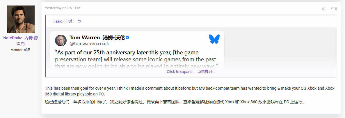 就在大家猜测不已时,知名可靠消息人士NatetheHate的爆料,给了玩家一个明确方向。据他透露,微软兼容团队已经投入一年多的时间,核心目标就是让玩家当年在初代Xbox和Xbox 360平台购买的游戏,能够在PC端正常游玩。熟悉这位消息人士的玩家都知道,他向来爆料谨慎,且过往情报的正确率极高,因此这份爆料的可信度不容小觑。