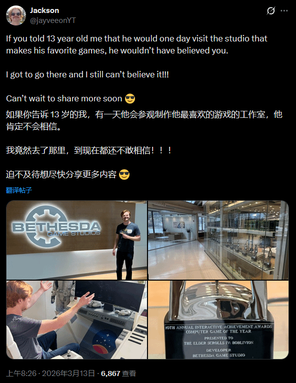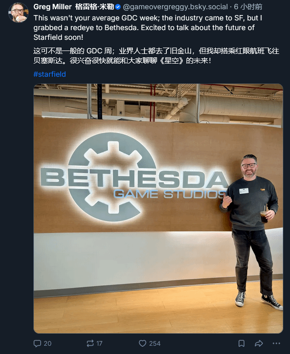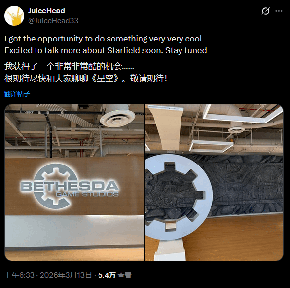 不止Juicehead一人,前IGN编辑Greg Miller近日也现身Bethesda,并且在社交平台明确提及了《星空》,与Juicehead的动态形成呼应。与此同时,Youtube知名游戏博主Jayvee也发文表示,自己收到了Bethesda的官方邀请,其发文左下角的配图中,还清晰出现了《星空》的Logo,直接暗示此次邀请与《星空》密切相关。