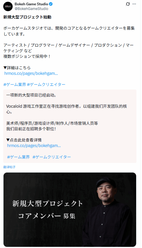 被誉为“寂静岭之父”的外山圭一郎,自2020年创立Bokeh Game工作室以来便备受业界关注。该团队曾在2024年推出了作品《野狗子》,而就在2026年3月13日,工作室正式对外披露,目前正全力投入一款“全新大型游戏”的研发工作,并同步启动了关键岗位的招聘计划。