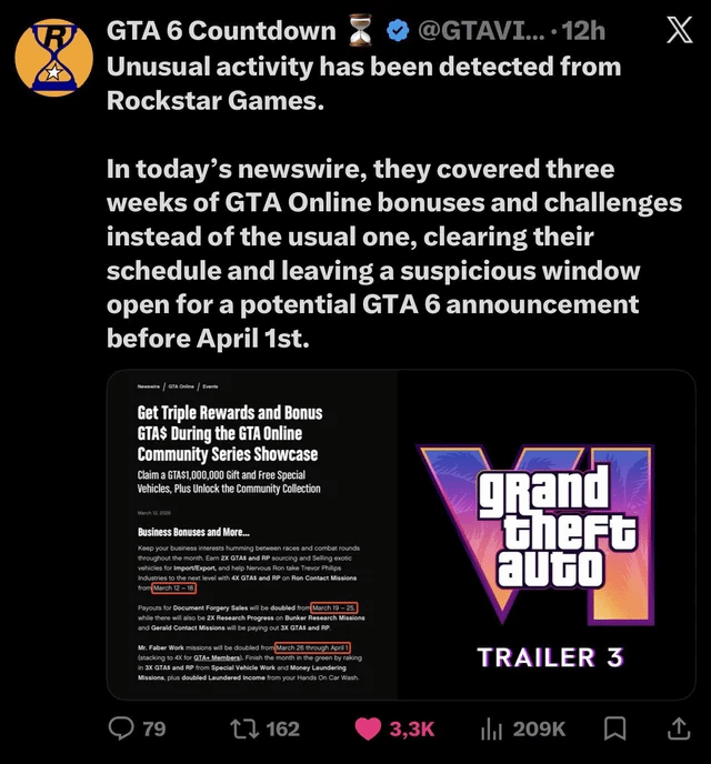 一向遵循惯例、每周进行常规更新的R星,近日却打破常态:没有按往常节奏推送内容,反而在Newswire上发布了一份覆盖三周、持续至4月1日的《GTA Online》完整活动路线图。这一不寻常的举动,很快被玩家捕捉到,不少人开始猜测背后的用意。